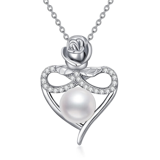 7-8MM Pearl Rose Flower Necklace Sterling Silver Love Heart Infinity Cross Pendant Necklaces Jewelry Gift For Her Women Girls Gift Mom